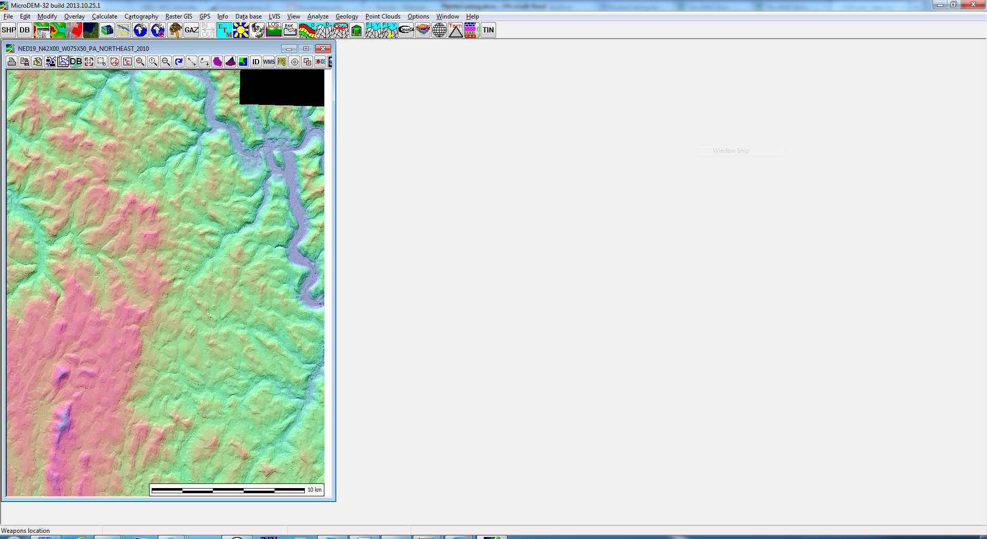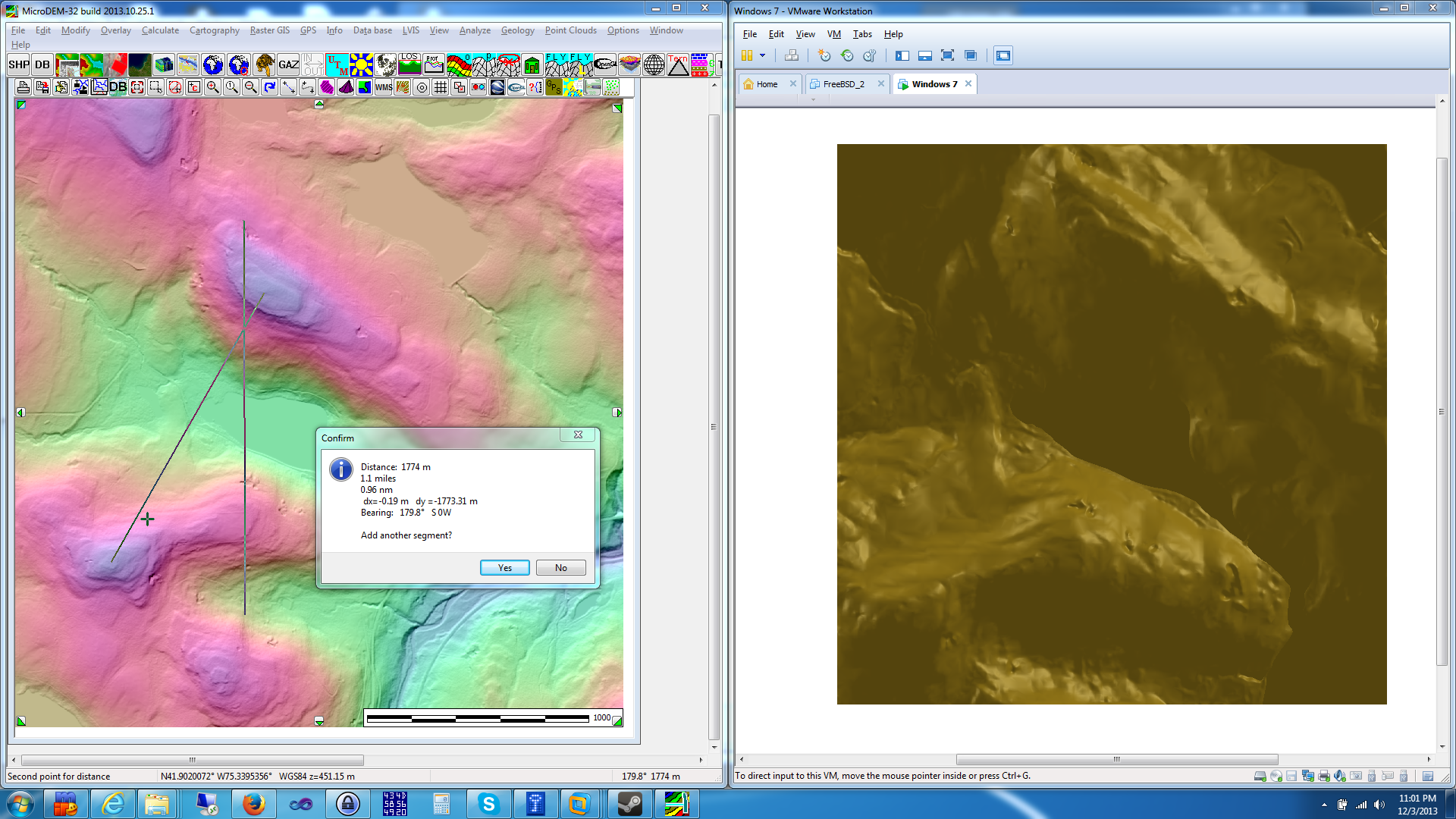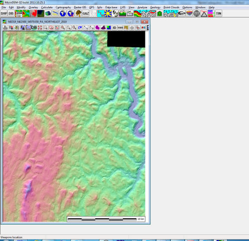 The USGS topographic data is available free on the USGS Store. I found the National Elevation Dataset easier to work with then GeoPDF. MicroDEM is apparently the software of choice to interpret this data according to my cartographer friend. That said, this isn’t the most robust piece of software I’ve ever seen so I’d recommend installing it on a VM (for instance, it only works correctly when installed to c:\microdem\). You’ll also need to extract FWTools to c:\microdem\fwtools\ to parse the USGS file format.