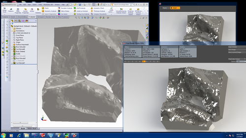 Now that I have a surface, I imported it into SolidWorks. Next I drew a box around the surface and extruded a solid terminating when it intersects the surface. The surface can now be deleted and a new cube is cut out of the bottom side of the existing solid, leading to a “floor” that intersects the original (now deleted) surface allowing a void at the lowest points. This gives the impression of a lake and outflow complementing the natural lay of the land. Finally, a new solid is extruded from the now trimmed base, giving more definition on the bottom of the model.